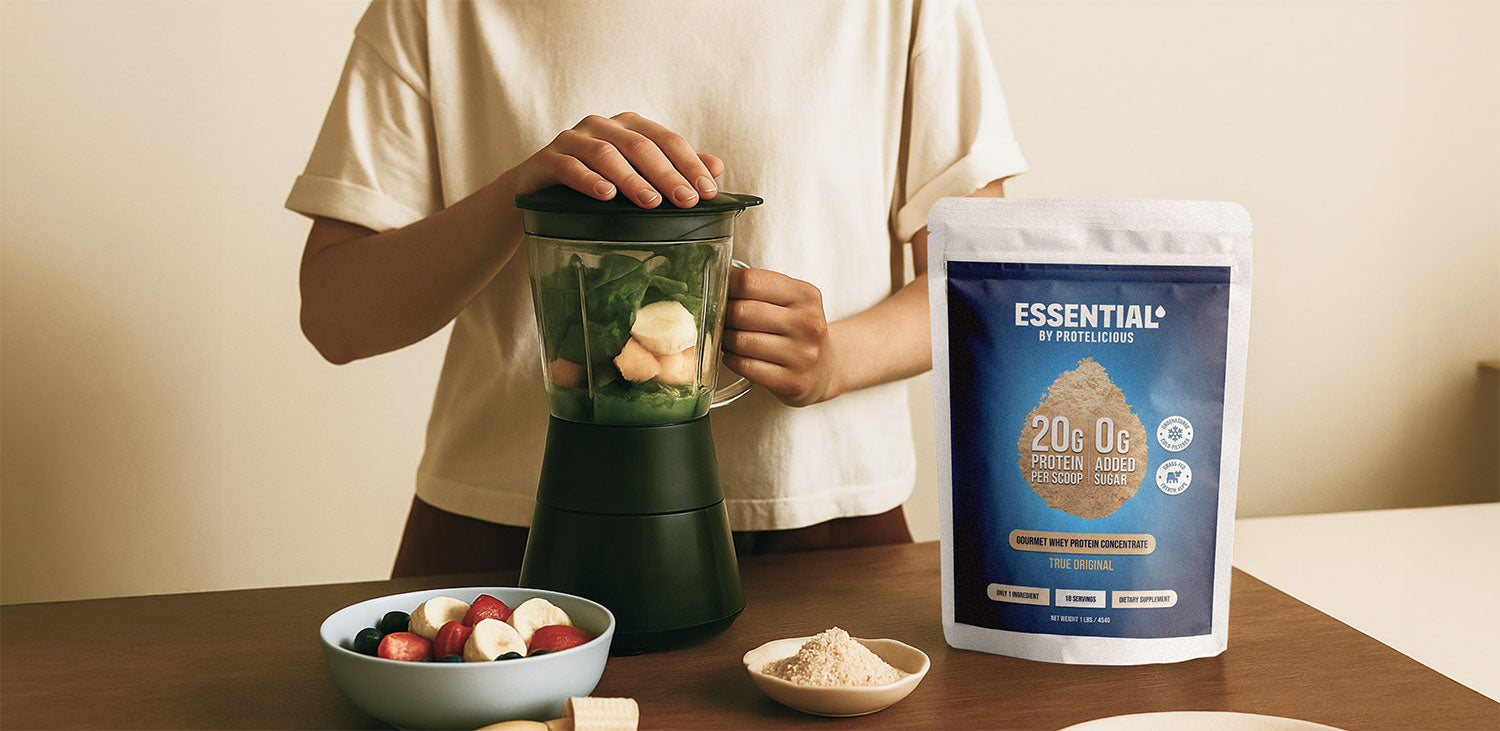 ESSENTIAL by Protelicious, our flagship Gourmet Whey Protein Concentrate.